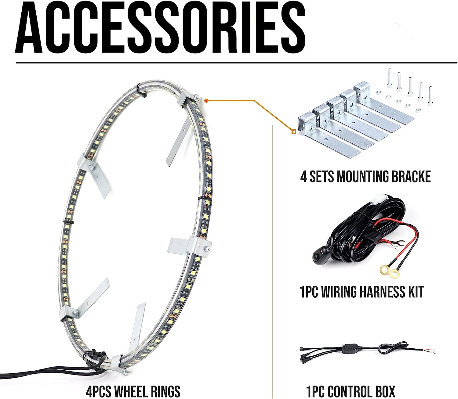 4PCS RGB Wheel Ring Lights with Wires, 1PC 10FT Wire Harness kit, 1PC Controller ,Wiring instructions , 1PC Remote, 20PCS Mounting Brackets |