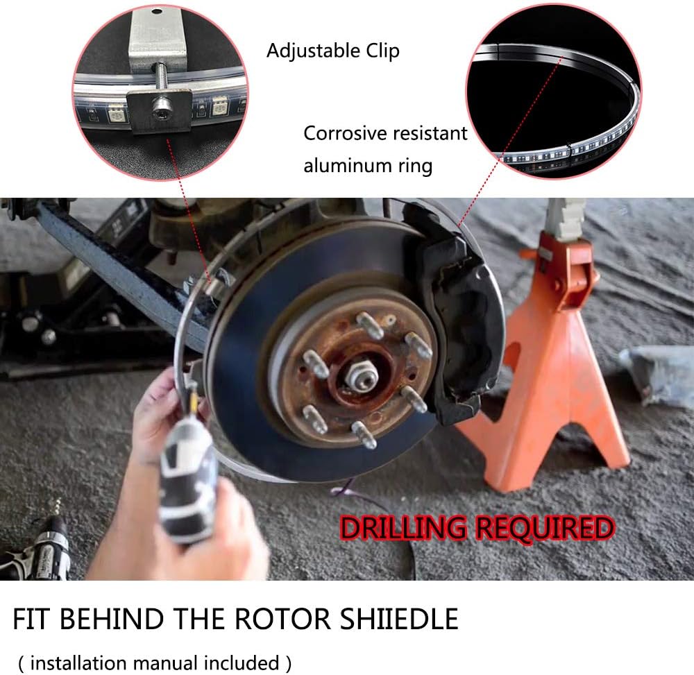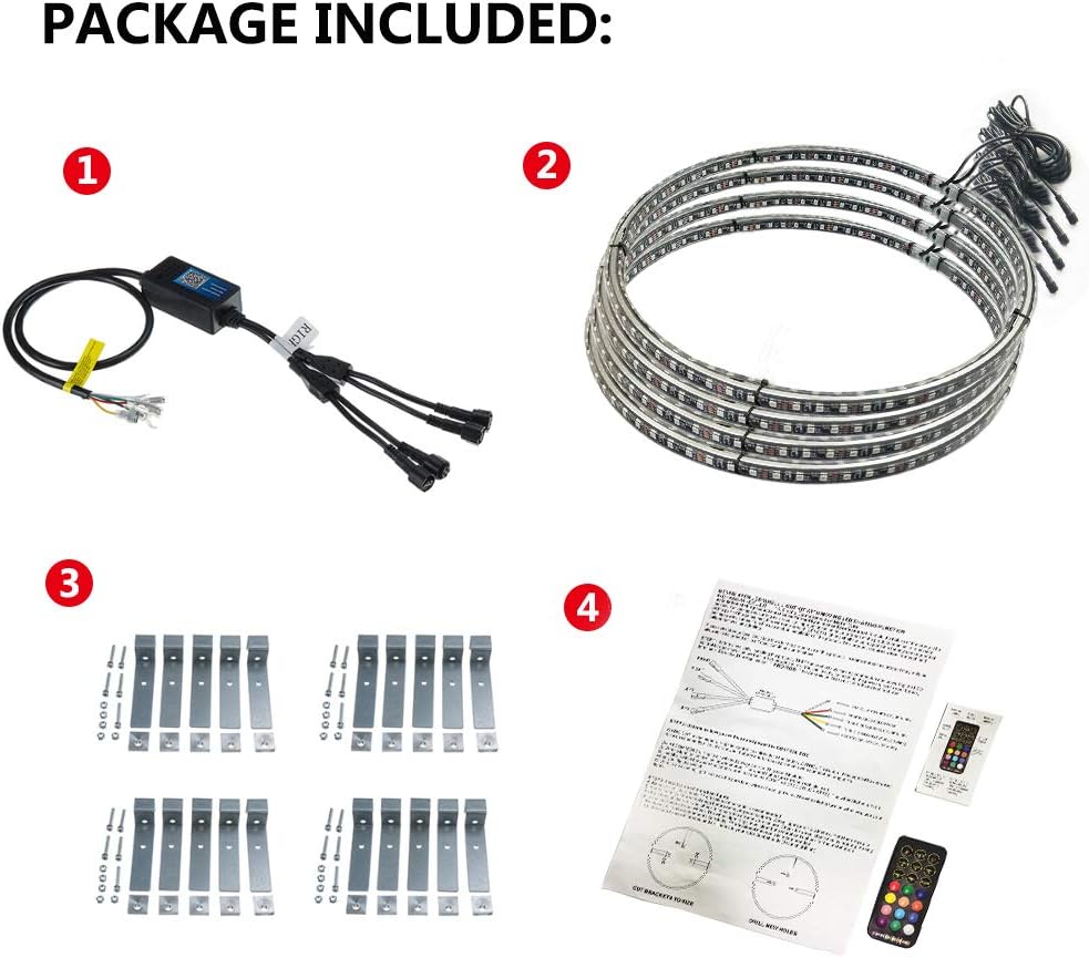 4PCS RGB Wheel Ring Lights with Wires, 1PC Control Box ,Wiring instructions , 1PC Remote, 20PCS Mounting Brackets |