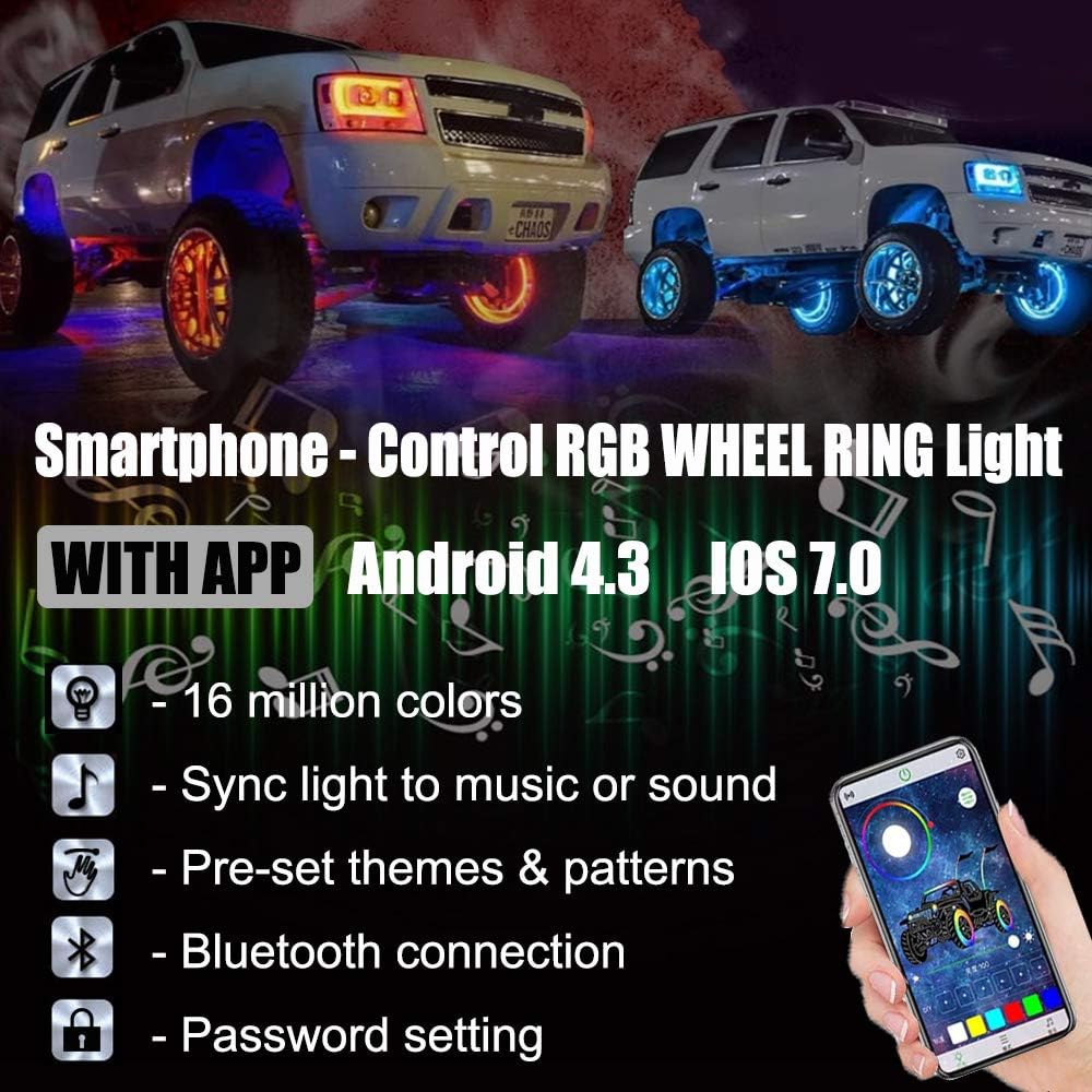 Beatto RGB LED Single & Double Row Wheel Ring Light Kit with App+RF Remote Control for ATV/UTV/SXS/Jeep/Truck/Car