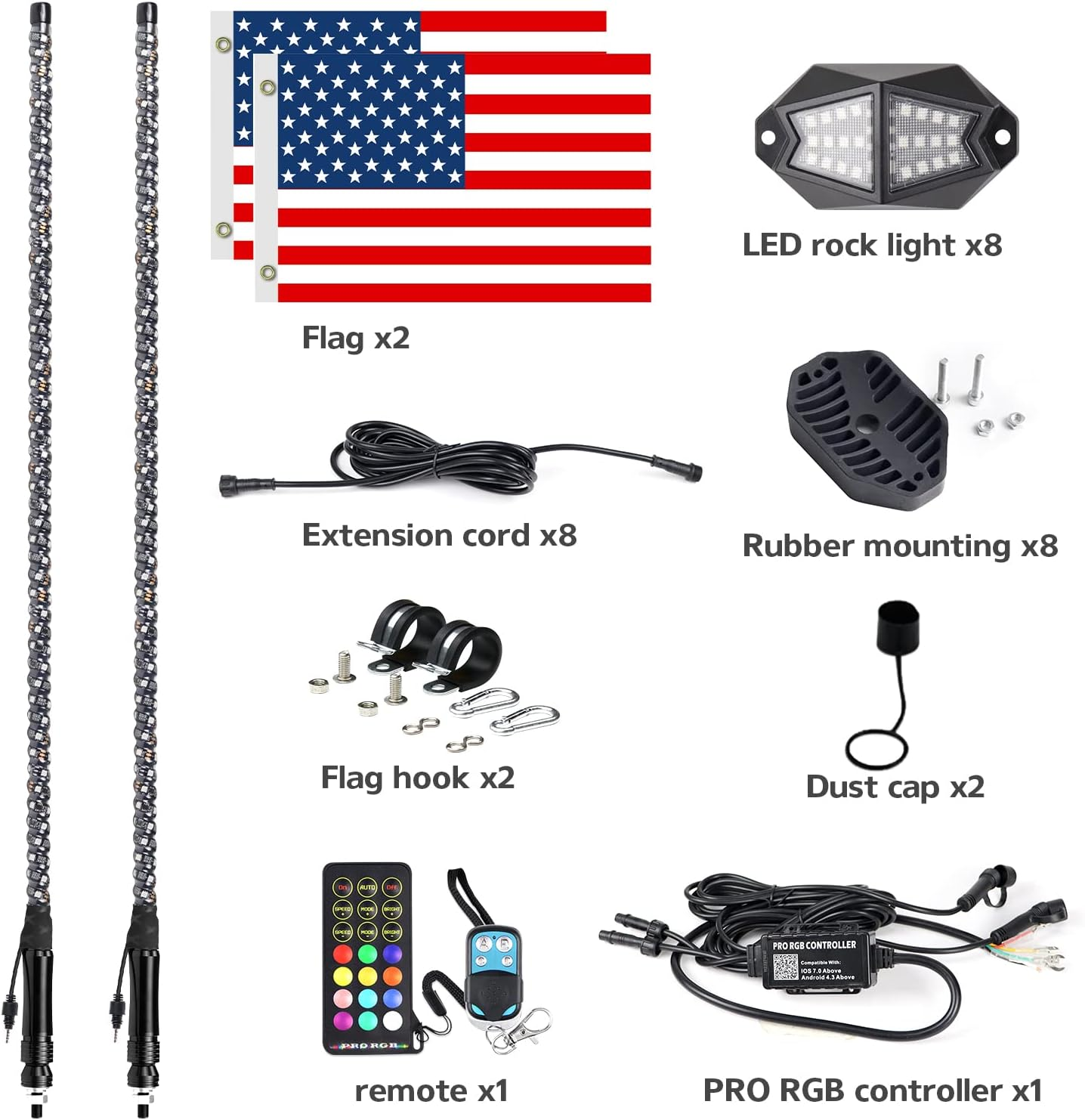 2pcs whip light with 2pcs 10ft wires, 2 pcs Flags with hook, 2 pcs Dust Cover,4 pcs Zip Ties,4(or 6 or 8)pods rock light with 10ft wires, 4(or 6 or 8)pcs Rubber Pad with Screws,1 pc rf remote, 1pc app+rf controller,1 x User Manual |