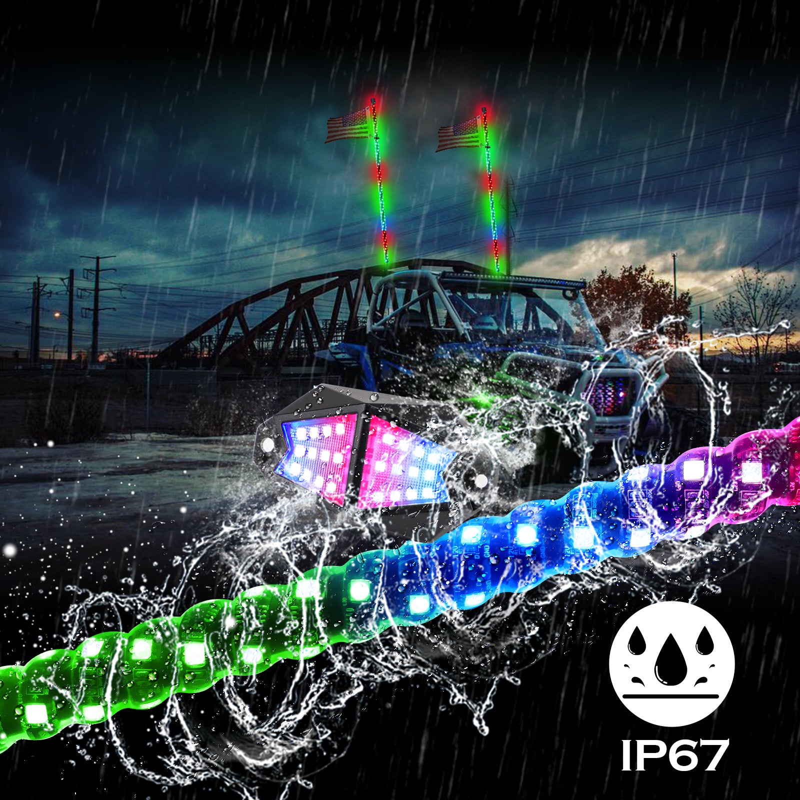 APP or REMOTE Controlled - A single LED driver powers both whip lights and 4 rock lights to ensure patterns and color changes are done together; BONUS FEATURE Brake Light function and Turn Signal function and Reverse Light if wired! |